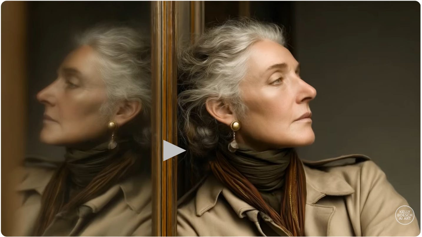 This sensitive video by Kelly Boesch eloquently describes the beast and the beauty of aging, with emphasis on the latter. Kelly is an extremely gifted artist who uses AI as her tool of expression. Whether you are for or against the use of AI in artistic creations (or anywhere, for that matter), I hope you will watch her video for its message, and not get caught up in debating its method.