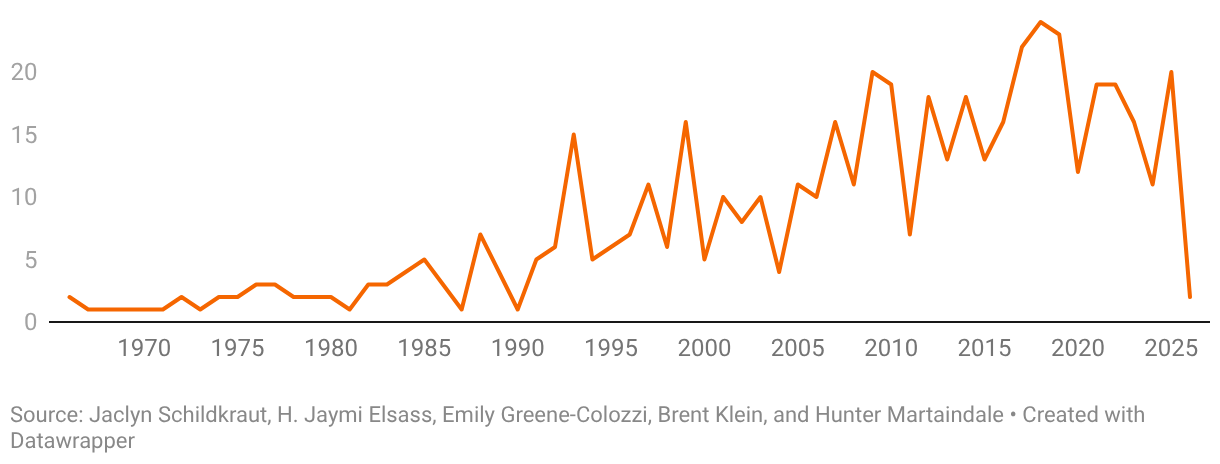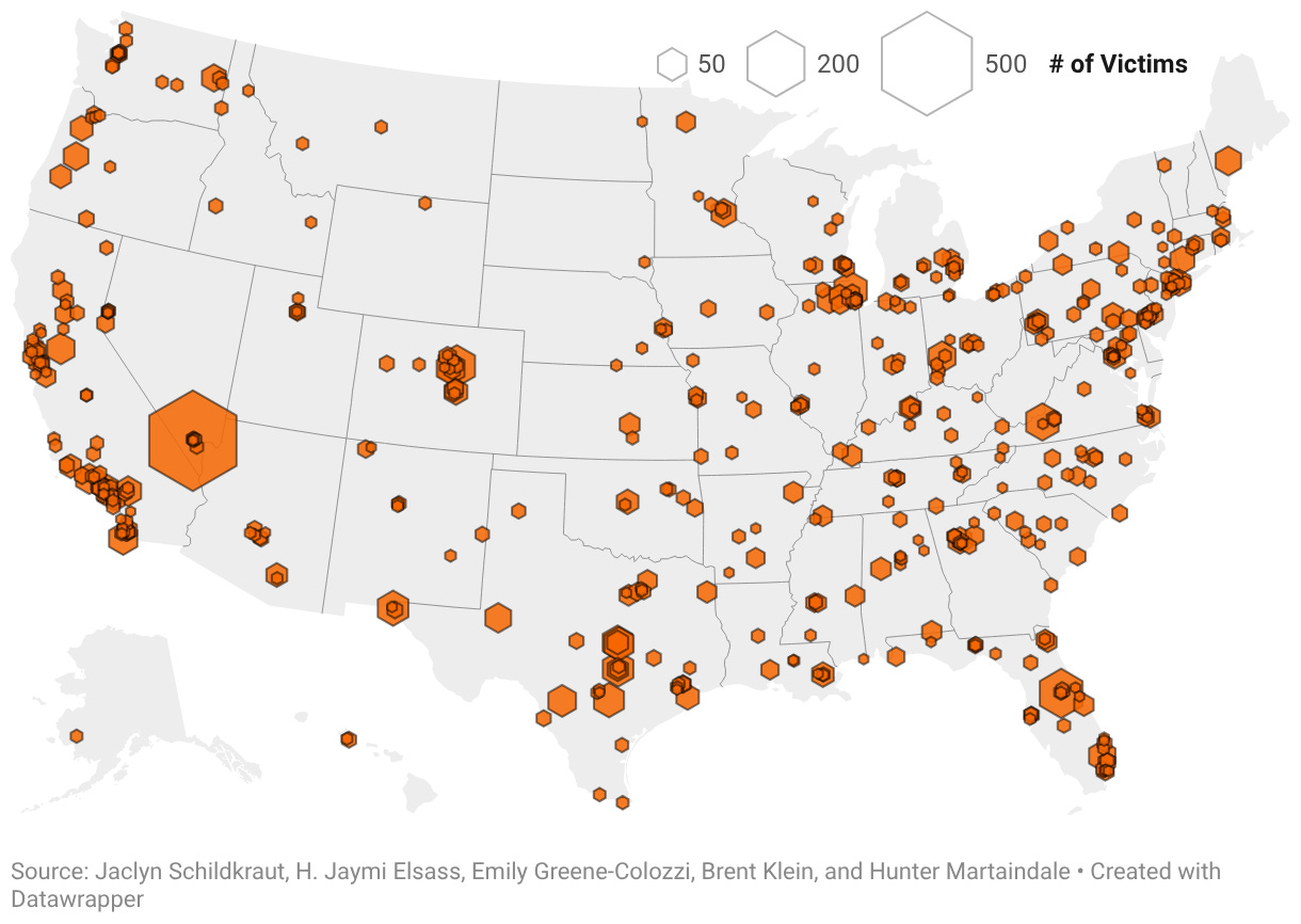 This map shows the place, date and casualty count of mass shootings from 1966 on, which you can access by clicking on the hexagons on the interactive version on the Rockefeller Institute’s page.