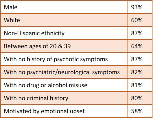 “…the mass shooters that we hear the most about, such as school shooters and other individuals who commit such public crimes, we have examined a number of these cases and are seeing a pattern. As opposed to most mass shooters, these perpetrators tend to be younger males who are often nihilistic, empty, angry, feel rejected by society, blame society for their rejection, and harbor a strong desire for notoriety. They want to make their mark on the world that will elevate them to the status they believe they are entitled to and deserve.”