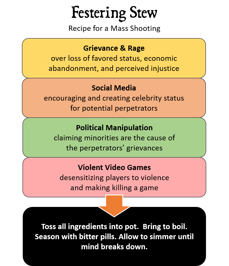 “What my colleagues and I call the “Three Ns”: need, narrative and network, refer to the would-be shooter’s need to become significant or notorious, the narrative that says being a shooter means being important, and the network that exists to support such behavior [all emphasis mine]. They together combine into a toxic mixture, driving a person to carry out a mass shooting.”